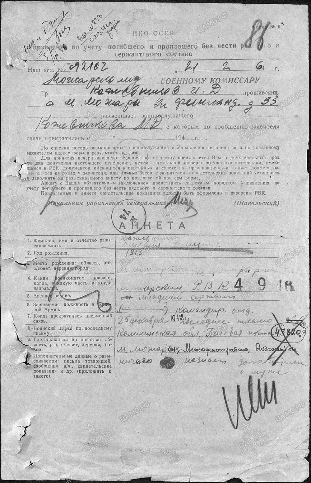 Михаил Дмитриевич до войны был участковым милиционером. С объявлением всеобщей мобилизации активно участвовал в формировании отрядов военнообязанных и их отправке к дальнейшему сборочному пункту. В сентябре 1941 года вместе с другими односельчанами, а их в общей численности призвали из села более 800 человек, сам ушел на фронт.