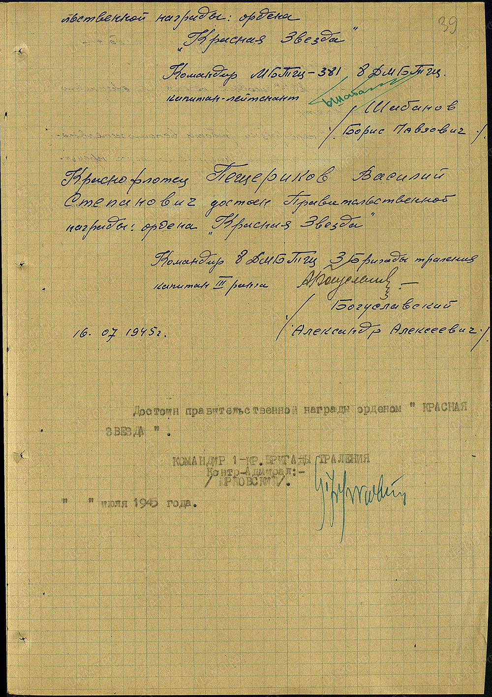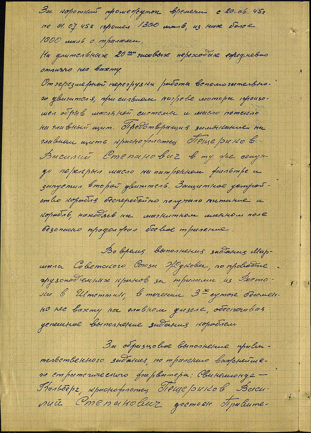 Из наградного листа: «Во время выполнения задания Маршала Советского Союза Жукова по проводке грузоподъемных кранов за тралами из Ростока в Штеттин в течение 3-х суток бессменно нес вахту на главном дизеле, обеспечивая успешное выполнение задания кораблем».